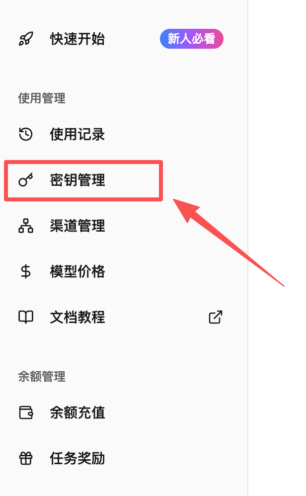 登录您的账户后,请看向左侧导航栏。找到并点击 「密钥管理」 菜单项